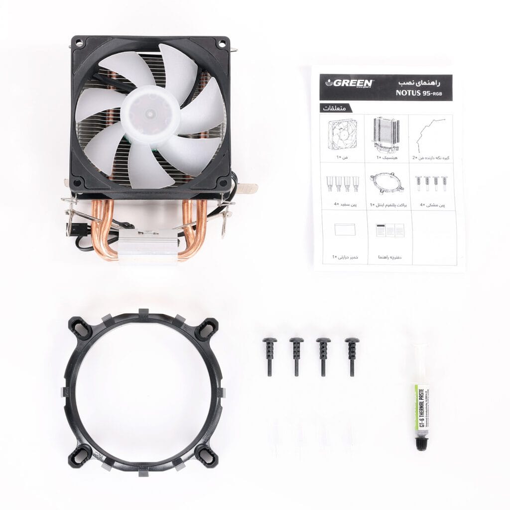کولر بادی notus-95-rgb گرین با اتکا به 2 هیت پایپ مسی با قطر 6mm و تکنیک تماس (Heat-Pipe Direct Touch (HDT، فن فوق العاده کم صدا و بادوام 2000RPM با ابعاد 92mm ، نورپردازی FRGB در کنار ابعاد سازگار با تمامی کیس های موجود در بازار، وزن کم و نصب و راه اندازی آسان آماده میزبانی از مدرن ترین پردازنده های دسکتاپ حال حاضر بازار خواهد بود